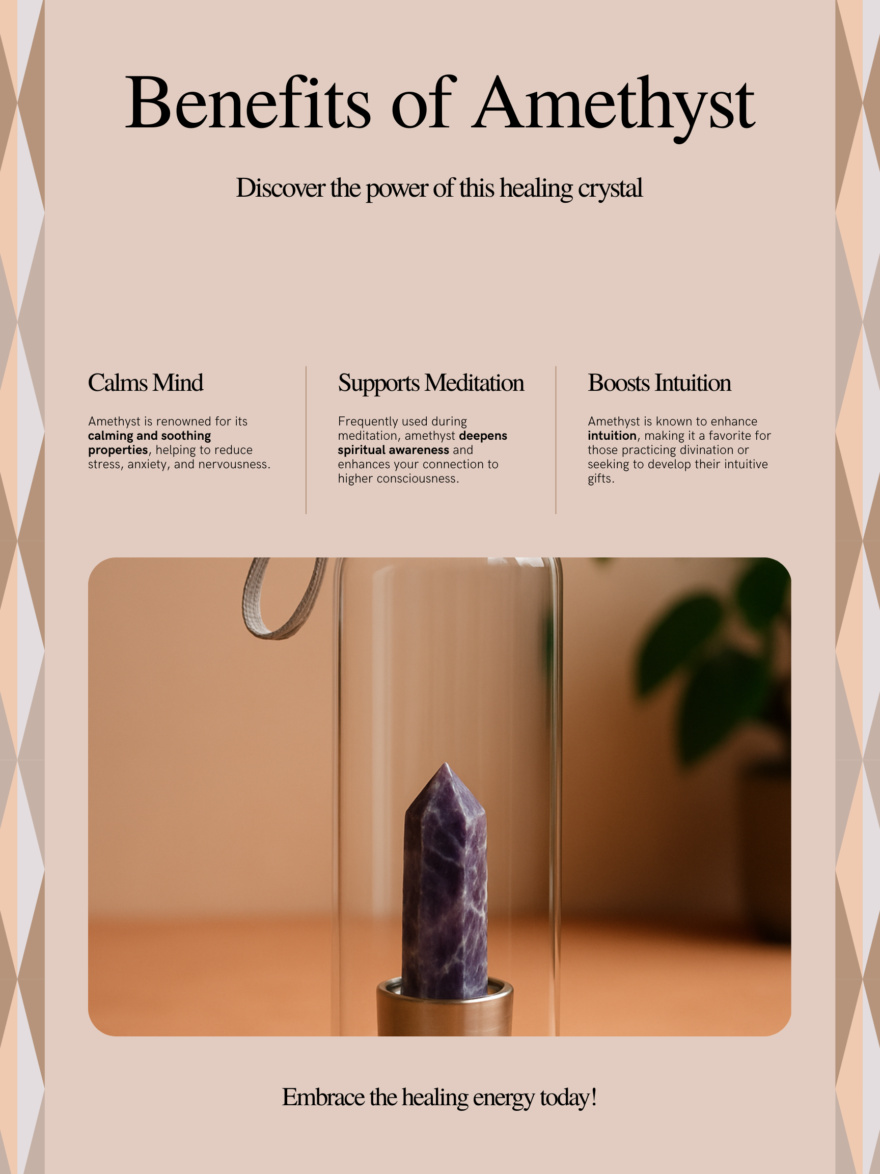 The Amethyst's Water Bottle harnesses the natural calming and balancing properties of amethyst crystals infused within its design. Ideal for daily hydration, it helps promote mental clarity and emotional tranquility as you drink. Perfect for enhancing mindfulness during your wellness routine, this bottle supports relaxation while keeping you refreshed. Durable and stylish, it makes a thoughtful companion for work, meditation, or outdoor activities.