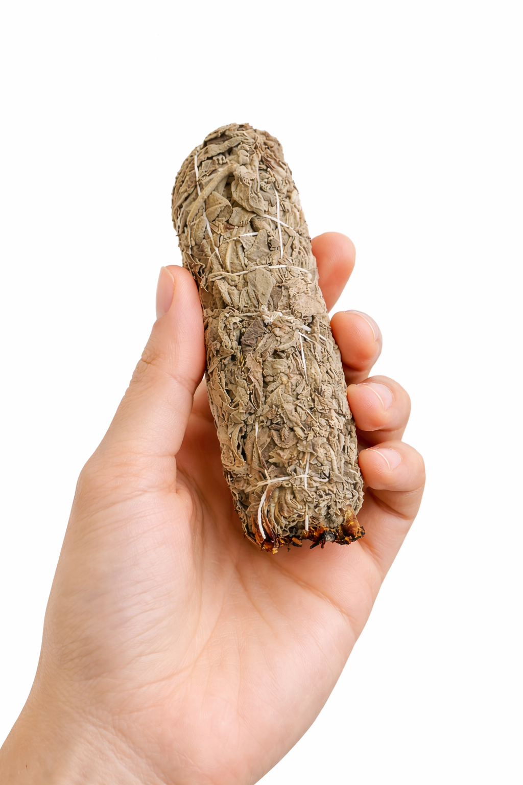 • Product Name: Indian Sage Smudge Stick • Material: Natural Dried Indian Sage Leaves • Color: Natural Grey-Green • Shape: Cylindrical (Hand-tied) • Length: Approx. 12 cm • Diameter: Approx. 3 cm • Weight: Approx. (may vary slightly as it is natural) • Aroma: Earthy, Herbal, Natural • Usage: Energy Cleansing, Spiritual Use • Packaging: 1 Smudge Stick (Handcrafted) • Country of Origin: India